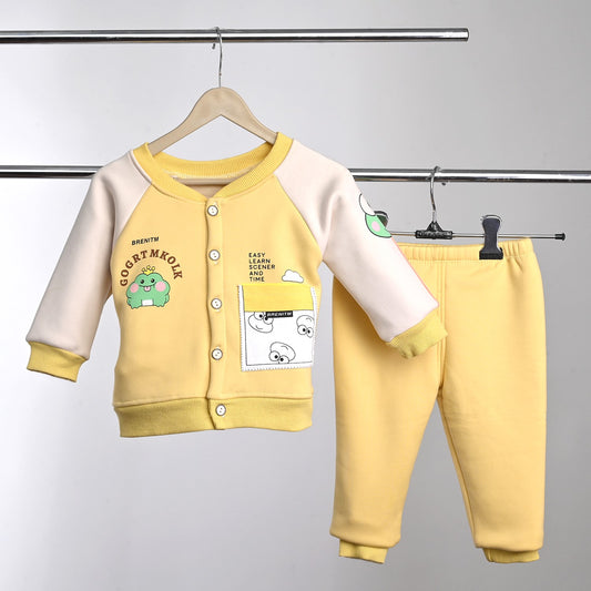 2pcs Baby Boy/Girl Cute Froggy Pattern Fleece Bright Yellow Buttoned up Shirt and Joggers Set