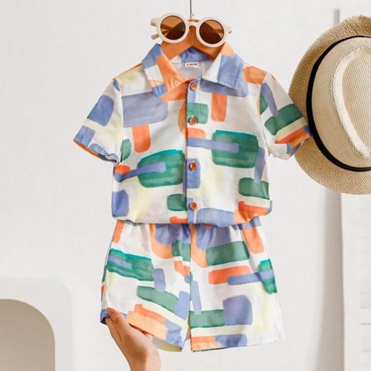 Sale2pcs Boy Fashionable Classy Abstract Geometric Print Short Sleeve Beige Shirt And Shorts For Spring/Summer