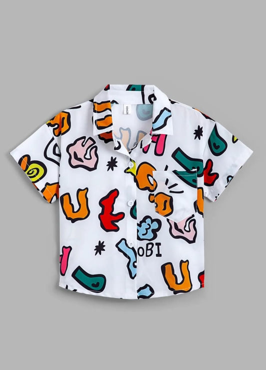 Sale2pcs Boy Comfortable Fashionable Abstract Print Breathable White Short Sleeve Shirt And Shorts For Spring/Summer