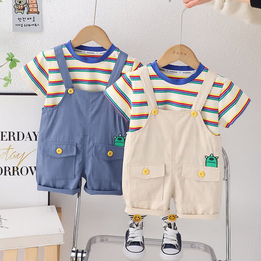 2pcs Baby Boy/Girl Short-sleeve Striped Tee and Cartoon Alien Print Beige Denim Suspender Shorts Set