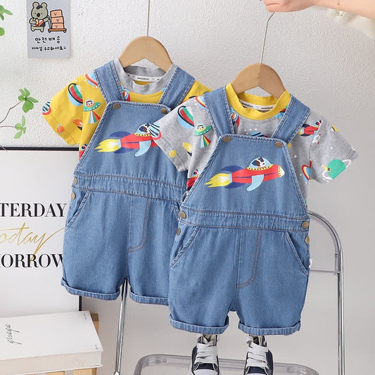 2pcs Baby Boy/Girl Short-sleeve All Over Space print Grey Tee and Rocket Print Blue Denim Suspender Shorts Set