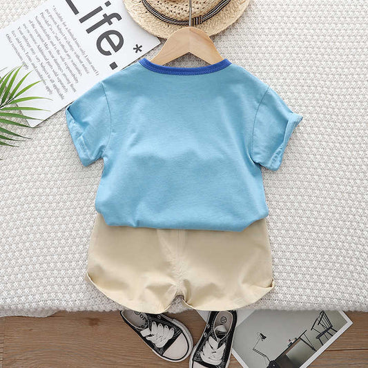 2pcs Toddler Boy Casual Monkey Print Blue Round Neck Tee and Solid Beige Shorts Set