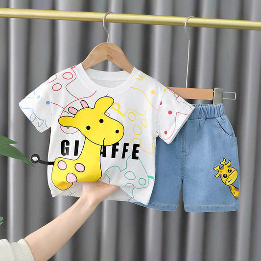 2pcs Toddler Boy Casual Giraffe Print White Round Neck Tee and Matching Blue Shorts Set (White)