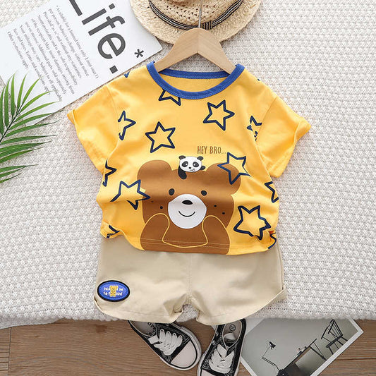 Sale2pcs Toddler Boy Casual Bear and Star Print Round Neck Tee and Solid Beige Shorts Set