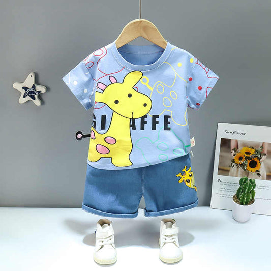 Sale2pcs Toddler Boy Casual Giraffe Print Round Neck Tee and Matching Blue Shorts Set