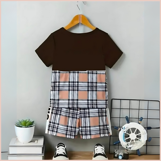 2pcs Baby Boy/Girl Plaid KING Print Short-sleeve T-shirt and Shorts Set