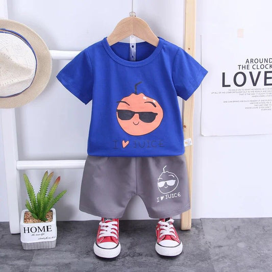 Sale2pcs Toddler Boy Casual I Love Juice Print Grey Round Neck Tee & Matching Blue Shorts Set