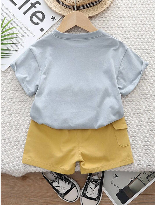 2pcs Toddler Boy Casual I Love Juice Print Grey Round Neck Tee & Matching Blue Shorts Set