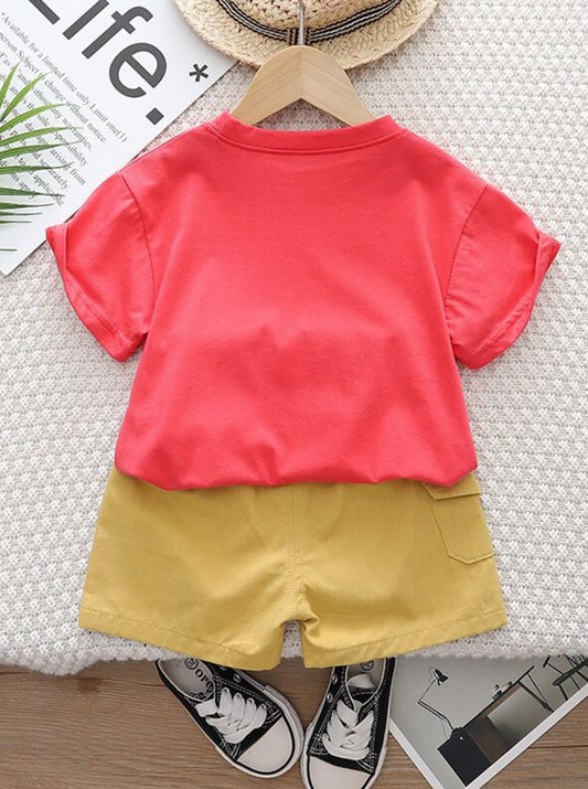 2pcs Toddler Boy Casual I Love Juice Print Yellow Round Neck Tee & Matching Blue Shorts Set